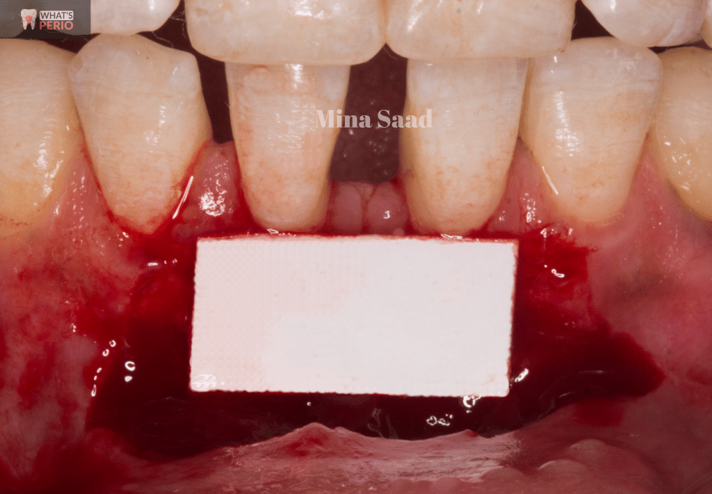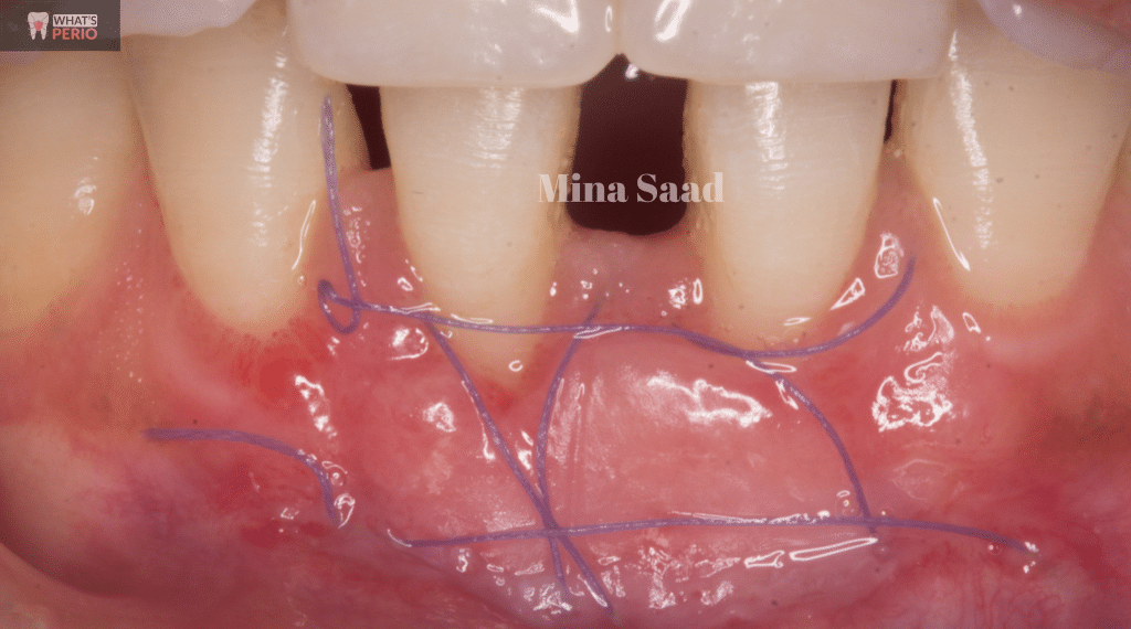 The coronal graft margin fits snugly over the exposed roots by the criss cross sutures to avoid blood clot contamination.