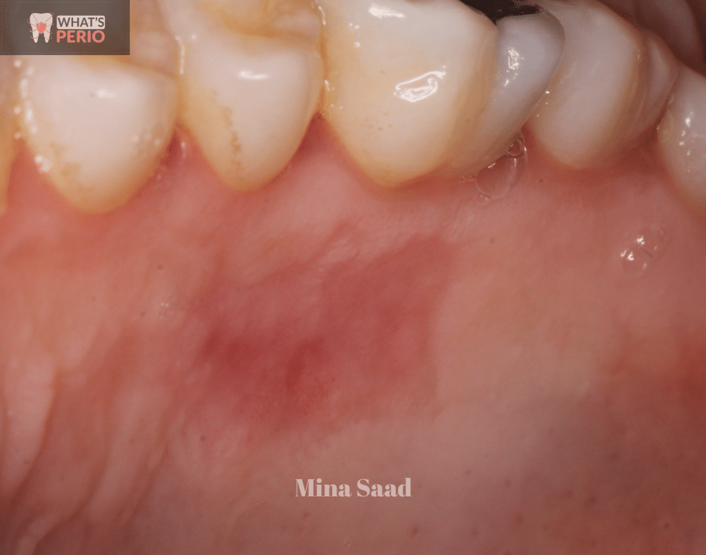 5-Very thin gingival phenotype or biotype (tissue thickness) which is one of the risk factors for gingival recession. “Note that the microvasculature was apparent in the whole alveolar mucosa”.