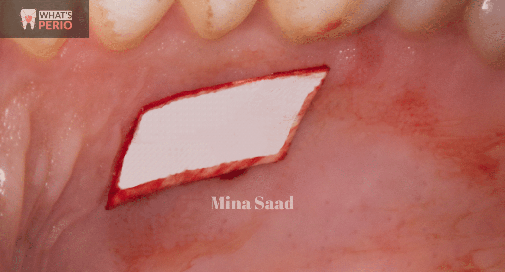 21-After 1 week, the patient came to our clinic & the periodontal pack was removed…..revealing a whitish layer was formed on the external surface of the graft.