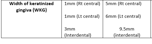 6-Very narrow zone of keratinized tissue especially all around the 2 central incisors. “almost 1mm from the free gingival margin to the mucogingival junction”.