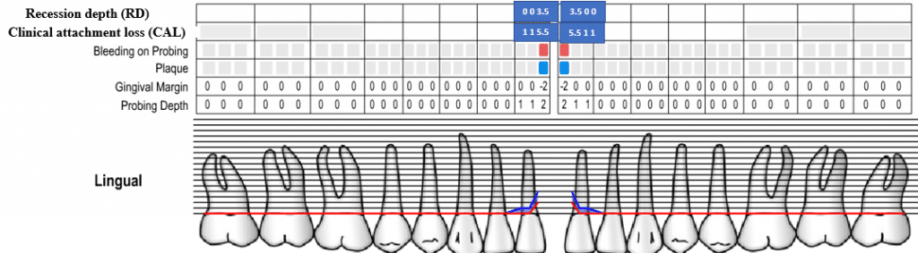 -Periodontal chart measurements for the 2 central incisors:-